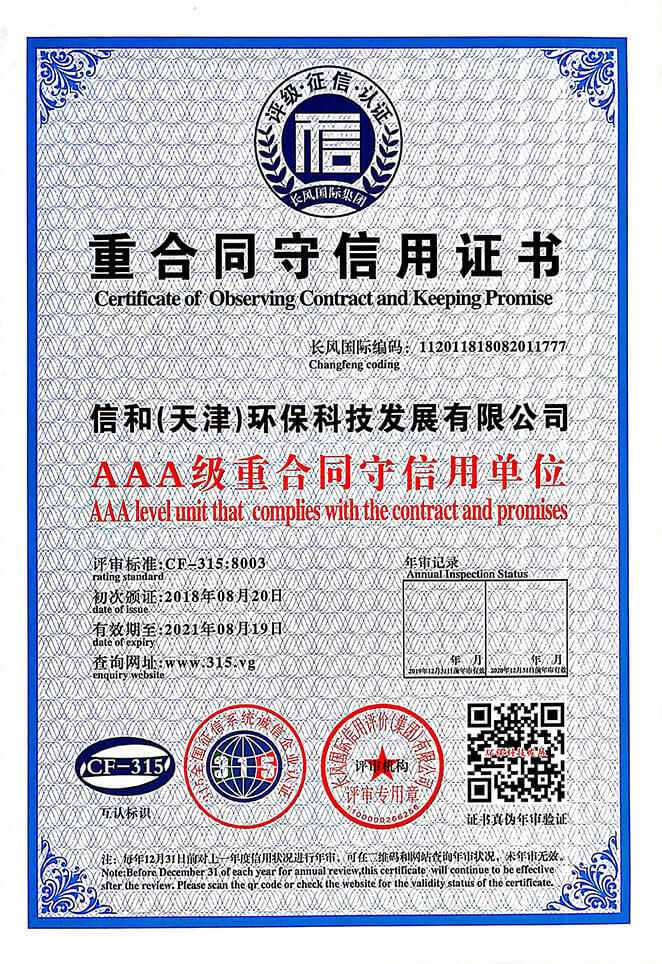 “質量就是生命”。信和重質量、守信用,被中國誠信品牌萬里行推薦“誠信示范單位”、“AAA資信等級”、“AAA級誠信經營示范單位”、“誠信經理人榮譽證書”、“誠信企業家榮譽證書”、“中國產品質量放心達標企業”、“誠信品牌聯盟會員單位”、“中國質量誠信AAA級品牌企業”、“中國百強優秀企業”、“節能環保推廣產品”、“全國科技創新企業”等榮譽稱號。